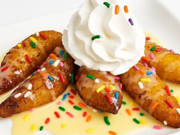 Fried Plantains with condensed milk, sprinkles, and whipped cream.