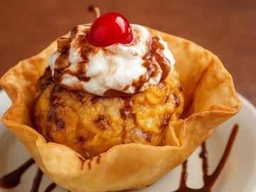 Fried crispy corn flakes, cinnamon, vanilla ice cram, chocolate syrup, whipped cream on a tortilla bowl.